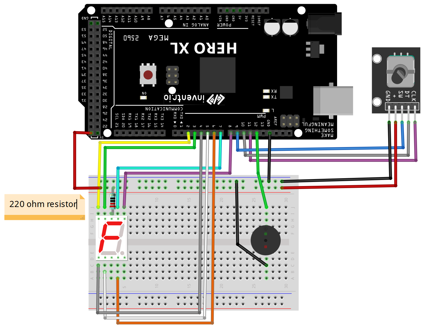 That's exactly what we're building. The rotary encoder becomes your voice, letting you "speak" numbers by turning a knob. The seven-segment display becomes the machine's face, showing your current guess. The button becomes a handshake, the moment you commit to your choice. And the buzzer becomes the machine's emotional response, celebrating your victories or commiserating your defeats.
